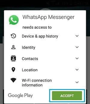 - Before installation there will be popup which will take your permission to access device and app history, identity, contact, location etc. Click on Accept option within green button.